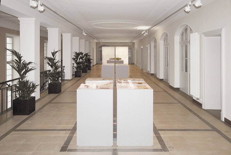 Display Ausstellungsgestaltung Entwurf einer Kollektion von Displayobjekten für wechselnde Ausstellungen. Die Objekte verstehen sich als mobil gewordene Verwandtschaft der Wandreliefs und fügen sich in die grafischen Ordnung von Decken- und Bodenfeldern ein. 24 Sockelobjekte und 4 Wanddisplays