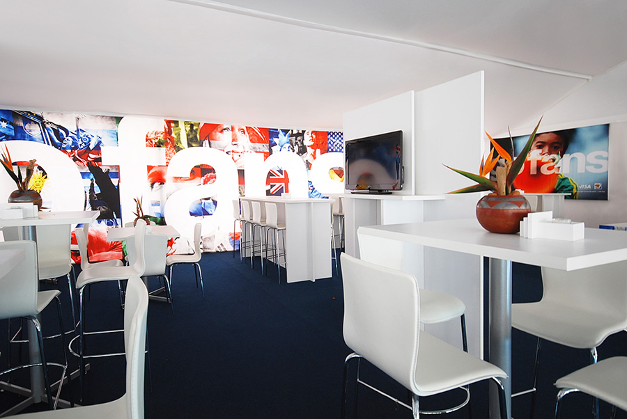 Temporäre Innenraumgestaltung für Lounges und Hospitality Bereiche in den Stadien und auf den Außengeländen für die Dauer der Weltmeisterschaft. Die Planung umfasst die Anordnung der temporären Zeltstädte, Umnutzung der Stadionlounges, Eventsignage und Interiors für verschiedene Gästekategorien. Anforderungen der Logistik, Sicherheit, Orientierung, Flexibilität und Modularität bestimmen maßgeblich die Entwürfe. Es wurde eine modulare Kollektion von Möbelelementen aus recyclingfähigem Leichtbaumaterial entwickelt. 16.000 m² Bgf, 10 Spielorte