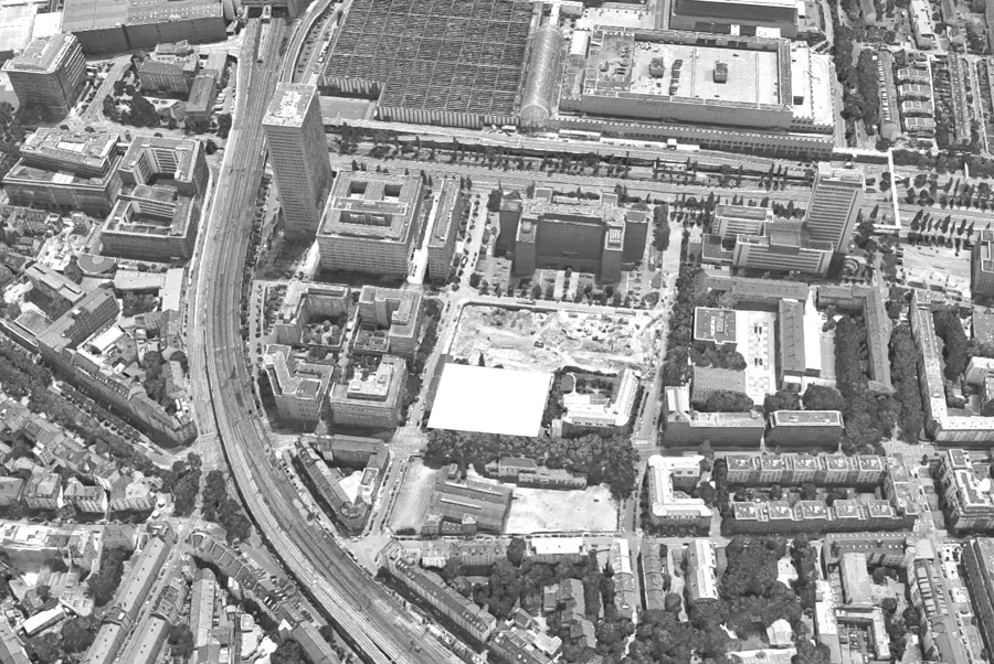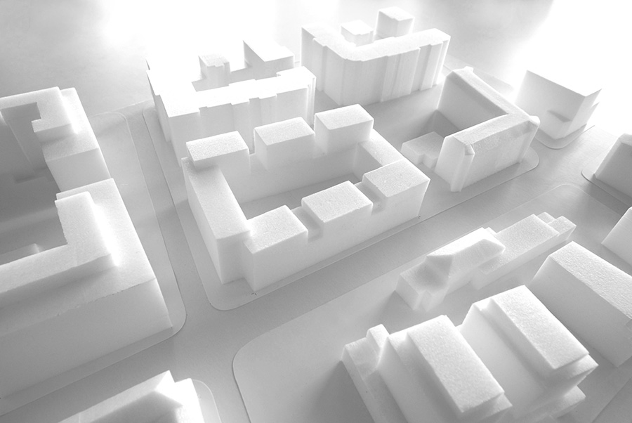 Das städtebaulich heterogene Umfeld ist geprägt von verschiedenen Formen zergliederter Blockrandbebauungen. Der Entwurf schlägt eine Typologie vor, die als gefügter Blockrand beschrieben werden kann. So vermittelt die Bebauung zwischen den angrenzenden gründerzeitlichen Blockrandbebauungen und den andererseits großteiligen offenen Blockstrukturen. Die vier Flanken des Blocks werden individuell entwickelt als Antwort auf die jeweils sehr unterschiedlichen stadträumlichen Gegebenheiten. Es entstehen vier Gebäudeteile mit variierender Traufhöhe, Silhouette, Fassadenrhythmus. Die Fügung der Gebäudeteile erfolgt als Collage. Durch die Verschneidungen an den Blockkanten entstehen signifikante Innenecken, die das Gebäude mit dem Straßenraum verknüpfen. Die dergestalte Ausformulierung der Gebäudeecke findet sich vielerorts in Gebäuden des Neuen Bauen Frankfurts. Der collagierte Block versucht die ruhende Ordnung der klassischen Blockrandbebauung mit der Dynamik des Stadtteils und seiner spezifischen Aussenräume zu verbinden. 18.000 m² Bgf, 185 Wohneinheiten