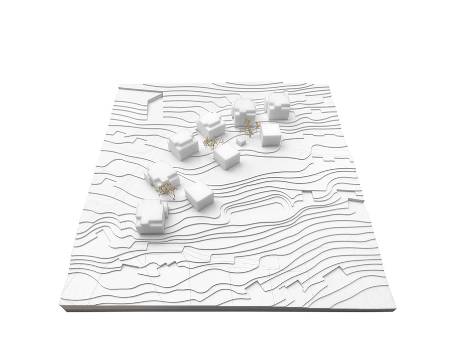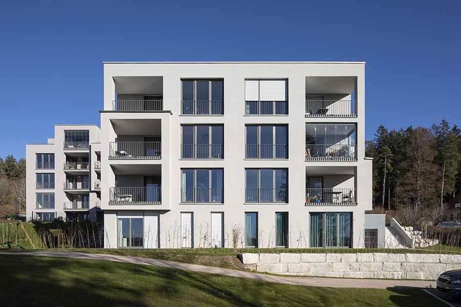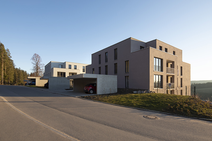 Als Auftakt von mehreren Bauabschnitten für das Wohnquartier "Schönblick" in Sankt Georgen im Schwarzwald gruppieren sich die ersten 3 Bauten entlang eines Waldrandes. Im Hang gelegen bilden die Körper durch ihre Stellung eine gemeinsame Mitte auf einem Geländeplateau aus. Von dort aus werden landschaftliche Raumbezüge inszeniert und in die plastische Gestaltung der Kuben überführt. Loggien und Terrassen rahmen unterschiedlichste Talblicke für ihre jeweiligen Bewohner. Die Fassaden führen in Silhouette, Relief und Farbklang den Dialog der Architektur mit der ländlichen Umgebung fort. 6.500 m² Bgf, 36 Wohnungen