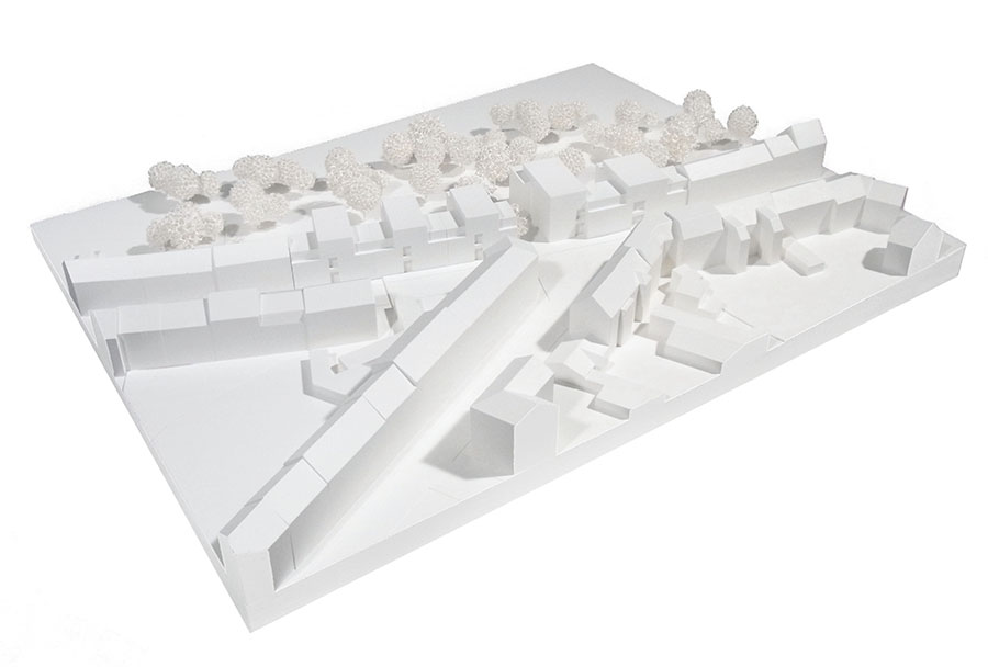 Die Fortführung der bestehenden Blockrandbebauung wird als ein Setzen von städtischen ´Häusern´ interpretiert, die als einzelne Adressen lesbar sind und die Baumasse entlang des Straßenverlaufs in maßstäbliche Segmente gliedern. Die Bauten bilden durch plastisch prägnante Eingangsbereiche und mittig aufstrebende Fassaden einen Rhythmus, der in der oberen Gebäude-Kontur durch die Staffelungen im vorletzten und letzten Geschoss ausformuliert wird. Die beiden thematischen Abschnitte ´Wohnen´ und ´Betreutes Wohnen´ sind dabei so gesetzt, dass der Durchgang zum rückwärtigen Park als Platzbereich aufgeweitet werden kann. Zum Park sind Wohnhöfe ausgebildet, die in ihrer kleinmaßstäblichen Ausprägung auch geschützte, halbprivate Außenräume mit entsprechenden Gartenanteilen ermöglichen. 11.000 m² Bgf, 86 Wohneinheiten