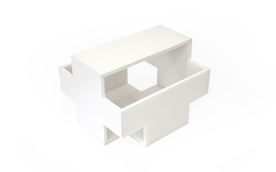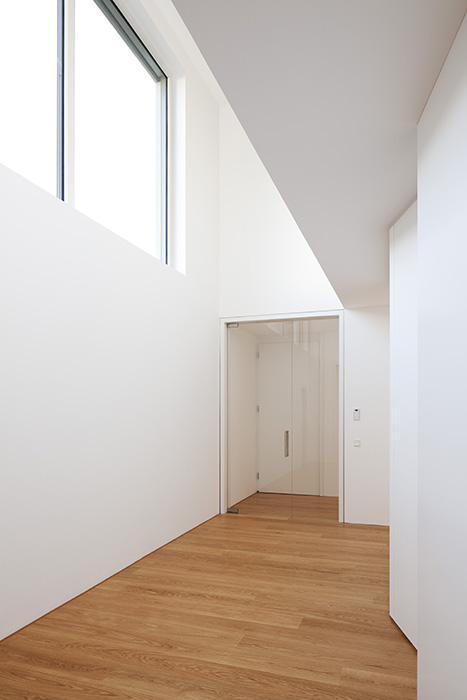 In einer Wohngegend mit homogener Bebauungsstruktur gelegen, konzentriert sich der Baukörper in Geometrie und Material auf sich selbst. Die Staffelung der Baumassen ereignet sich um die zentrale Eingangshalle. Die horizontale Verschiebung der Geschosse generiert den Wohnbereichen entsprechend Terrassen und Überdachungen. Dabei entsteht eine dem Ort und der Bestandsbebauung angemessene Gebäudesilhouette. Die großzügige horizontale Linienführung im Massivbau und eine detaillierte Ausbildung der Öffnungsbauteile erzeugen den eleganten und wertigen Ausdruck des Wohnhauses. 600 m² Bgf
